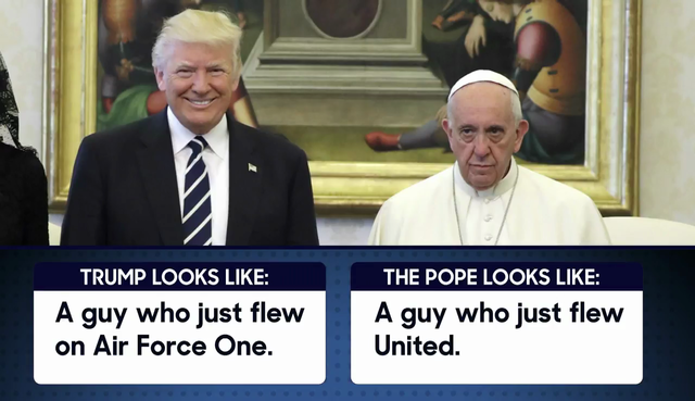 Значительную часть своего монолога ведущий шоу Джимми Фэллон уделил сравнению лиц президента США и папы римского на той самой фотографии. Например: «Трамп выглядит как человек, который прилетел „Бортом номер один“, а Франциск — как человек, который прилетел на United».