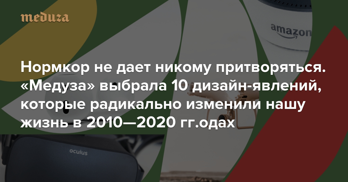 Многие явления и вещи, которые в конце 2019 года уже казались нам привычными, не существовали всего десятилетие назад. Это простая мысль; куда сложнее среди этих вещей выбрать те, что радикально изменили нашу жизнь. Но мы все-таки попытались. «Медуза» составила список из десяти дизайн-явлений — тут и устройства, и интерфейсные решения, и предметы быта, — которые не только символизируют собой уходящее десятилетие, но продолжают прямо сейчас оказывать сильнейшее воздействие на нас самих.