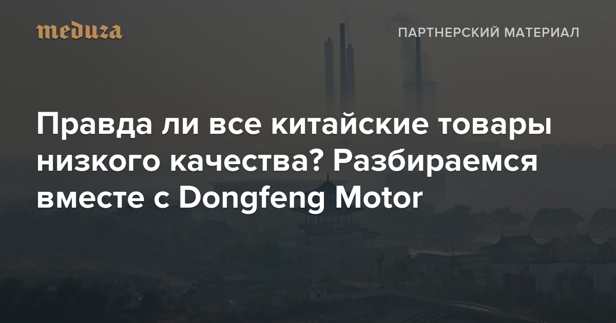 Считается, что китайским товарам нельзя доверять, они недолговечные и некачественные — эти стереотипы плотно засели в сознании многих. В то же время все наши магазины одежды, салоны связи, а теперь и автосалоны забиты китайскими вещами, техникой и машинами. «Медуза» вместе с компанией Dongfeng Motor разбирается, как обстоят дела с китайским качеством на самом деле.