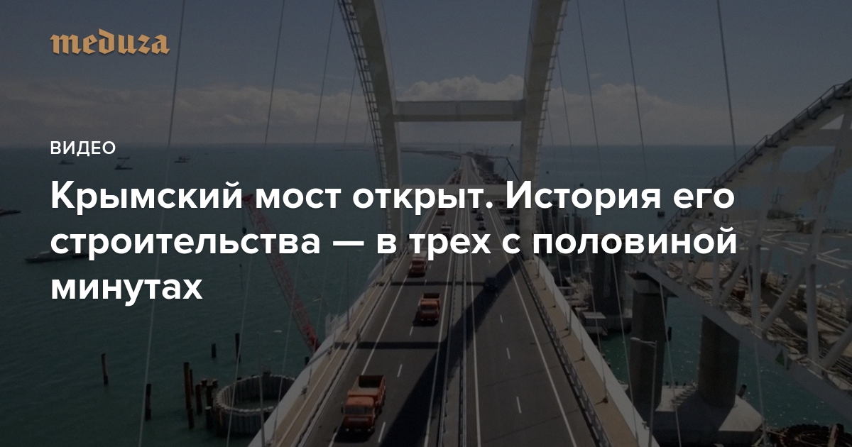 15 мая состоялась церемония открытия моста в Крым. В ней принял участие президент России Владимир Путин, который проехал по мосту на грузовике. Для регулярного движения автомобилей мост откроют 16 мая. Движение по железнодорожной части Крымского моста обещают запустить в конце 2019 года. История строительства моста в Крым — в видео «Медузы».