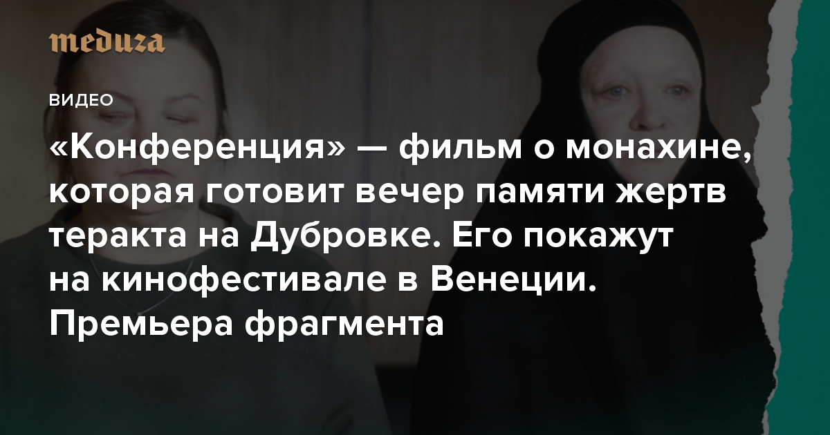 «Конференция» — фильм Ивана И. Твердовского, премьера которого состоялась в 2019 году в российском павильоне на Каннском кинофестивале. В 2020-м его покажут в программе Venice Days 77-го Венецианского кинофестиваля. Главная героиня картины — монахиня Наталья. Спустя 17 лет после теракта на Дубровке, случившегося 23–26 октября 2002 года, она приезжает из монастыря в Москву, чтобы провести в этом месте поминальный вечер — по документам он проходит как «конференция». Во время подготовки вечера Наталья пытается разобраться со своим собственным прошлым и заслужить прощение дочери. В фильме сыграли Наталья Павленкова, Ольга Лапшина, Ксения Зуева, Ян Цапник, Александр Семчев, Анна Слю, Виктория Верберг и другие. «Медуза» публикует фрагмент картины, в котором Наталья и директор Театрального центра на Дубровке договариваются о дате события.