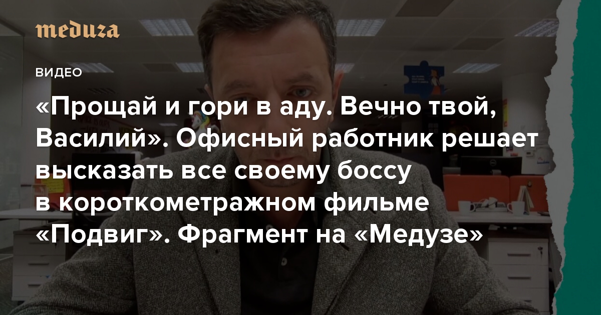 «Прощай и гори в аду. Вечно твой, Василий» Офисный работник решает высказать все своему боссу в короткометражном фильме «Подвиг». Фрагмент на «Медузе»