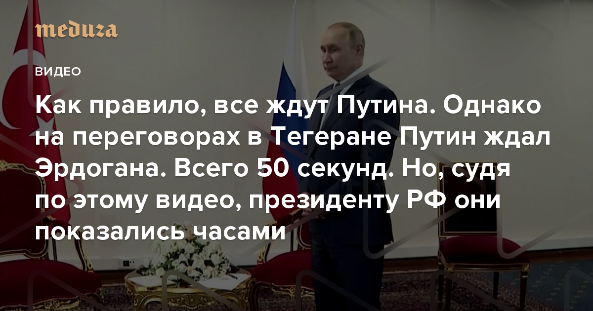 Президент РФ Владимир Путин нередко опаздывал на встречи, например, к папе римскому. Но 19 июля в Тегеране президенту РФ пришлось 50 секунд ждать, когда придет президент Турции Реджеп Тайип Эрдоган, с которым у него были переговоры. Судя по этому видео, ожидание далось Путину непросто.