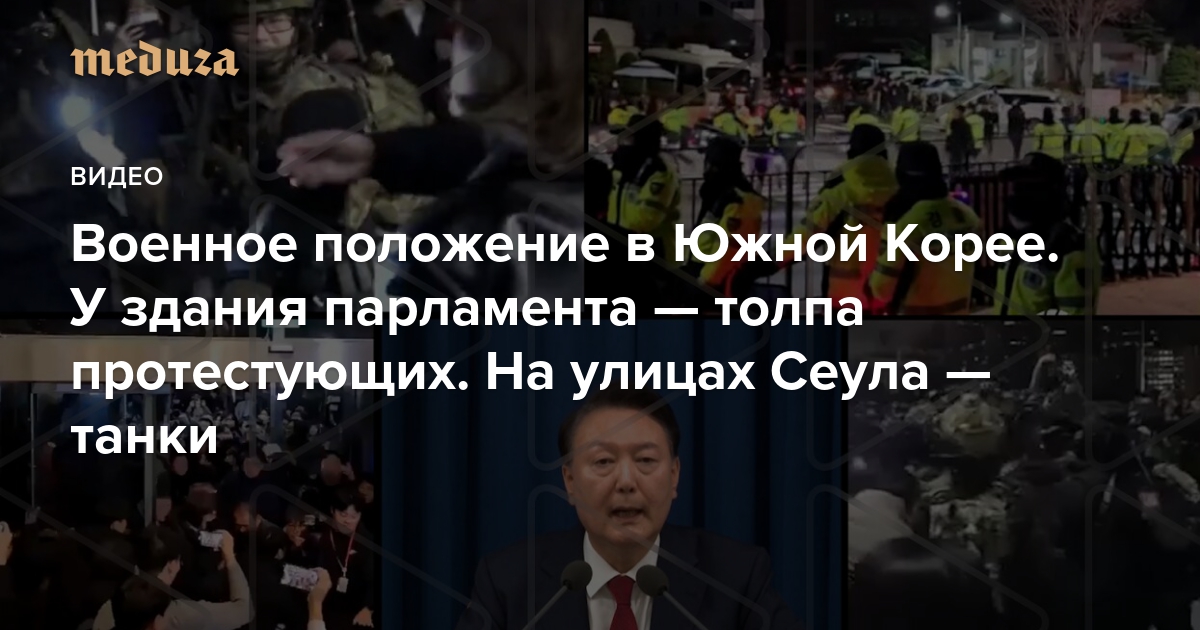 Президент Южной Кореи Юн Сок Ёль ввел военное положение, чтобы «искоренить отвратительные просеверокорейские антигосударственные силы». Теперь все СМИ страны находятся под контролем военных, а любая политическая деятельность, включая протесты, запрещена. Лидер оппозиционной Демократической рабочей партии Южной Кореи Ли Джэ Мён призвал сторонников собраться у здания парламента, которое оцеплено полицией. На улицах Сеула заметили военную технику, а над парламентом пролетел военный вертолет.