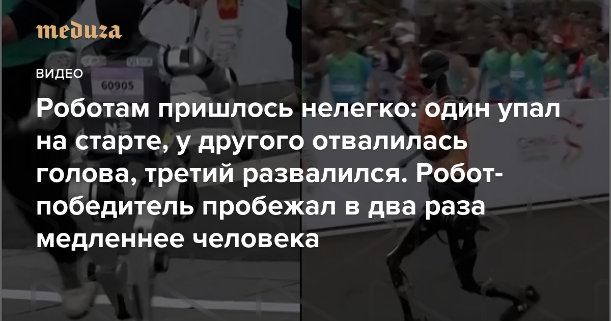 В Китае провели полумарафон для роботов и людей Роботам пришлось нелегко: один упал на старте, у другого отвалилась голова, третий совсем развалился. Робот-победитель пробежал дистанцию в два раза медленнее человека